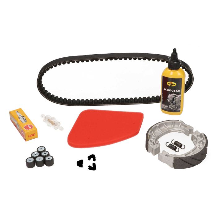 • Świeca zapłonowa Ngk • Element filtra powietrza Endurance • Wytrzymałość ról wariatora • Prowadnice wariatora Wytrzymałość • Pas klinowy wytrzymałościowy • Korona oleju przekładniowego • Filtr paliwa Endurance • Tylne szczęki hamulcowe Endurance Wagarolek wariatora 25 km/h: 13 gramów Wagarolek wariatora 45 km/h: 9,0 gramaZestawdo konserwacji wytrzymałościowej