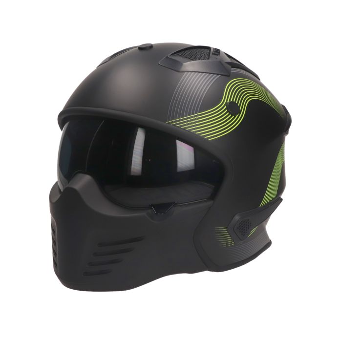 Z hełmem Vito Bruzano, na pewno się wyróżnisz. Kask ma agresywny design i jest to z pewnością zauważalne! Bruzano może być używany jako zwykły integralny hełm, ale także bez maski na twarz. Osłona dymu jest również łatwa do złożenia. Vito Bruzano w kolorze czarnym matowym jest dostępny w rozmiarach od XS do XL.Właściwości Vito Bruzano: