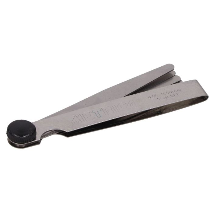 Za pomocą środka szczelinowego mierzysz szczeliny, na przykład w celu pomiaru luzu zaworowego silników czterosuwowych. Rozmiar sondy składa się ze stalowych łopatek o różnych grubościach, od 0,05 do 1,00 mm.Właściwości tej miary czujnika